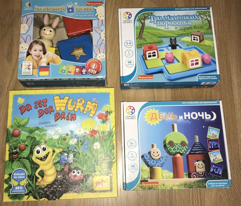 Головоломки «Застенчивый кролик» (с 2л8м), День и ночь (с 2л4м), «Три маленьких поросёнка» (подарена на 3г, но пошла с 3,3 кажется) отыграны на 100%, хотя и не все уровни ещё прошли (в Кролике).