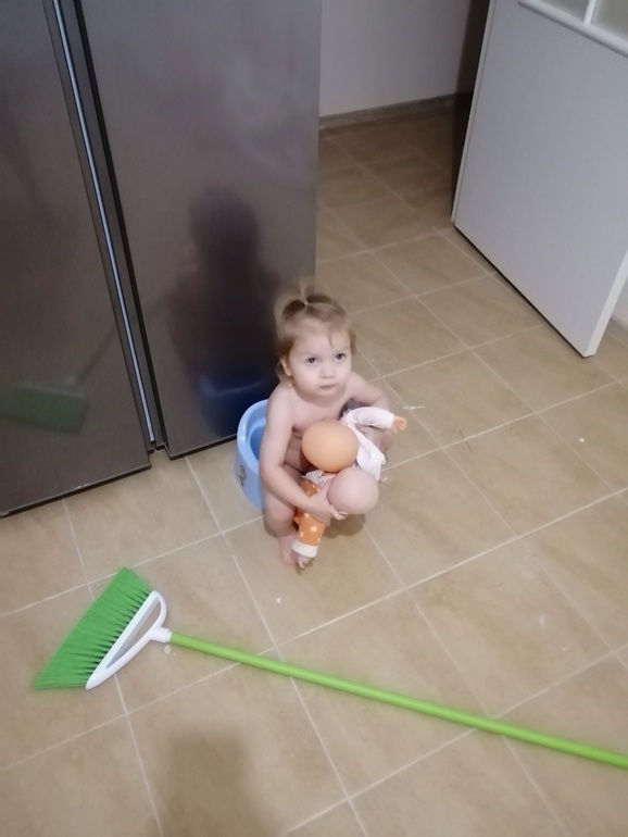 С горшком ещё не дружит. Вот несколько недель уже так - сидит, на туалет сажаю тоже, но терпит. Писает только в трусики-подгузник, может лужу сделать, если долго без трусов, но сама от этого не в восторге. Вроде понимание есть, но от теории к практике никак...