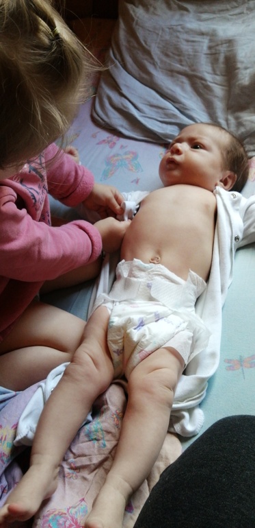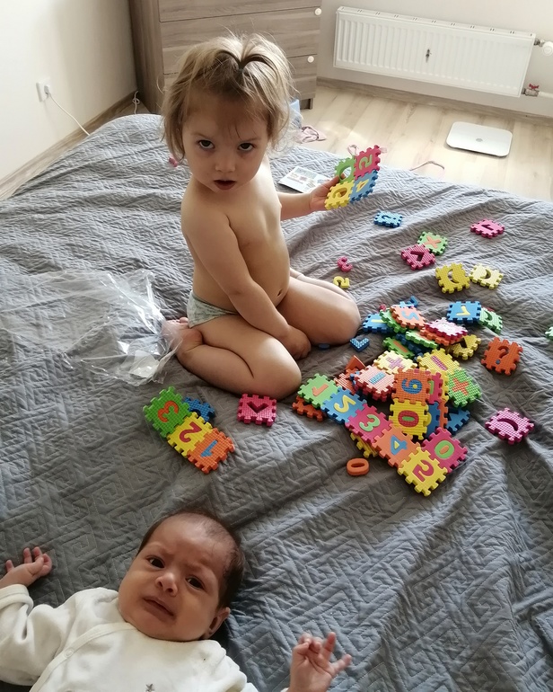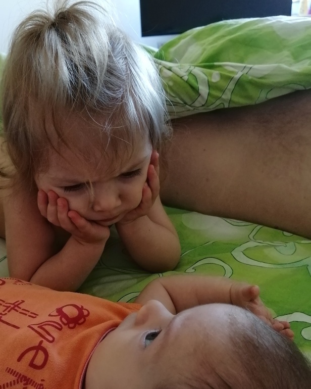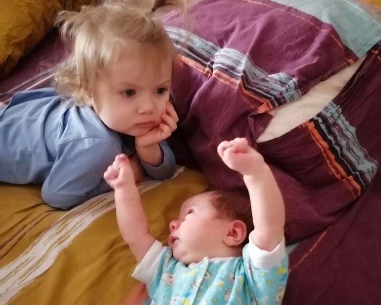 Хорошо себя ведёт с Катей, уже почти сама меняет подгузник, гладит, обнимает, не наступает на неё. Когда плохое настроение, может чуток возмущаться на неё, но мне кажется, тут ничего личного, на других тоже возмущается. Так Валюху вполне устраивает, что с одной стороны она, с другой Катя. Иногда разглядывает Катю серьёзно, наверное, пытается найти ей применение 😅