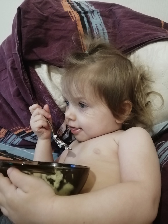 Ест как-то странно и мало. Ну как, ей пары ложек каши может хватить на полдня. Но может нормально покушать под настроение.