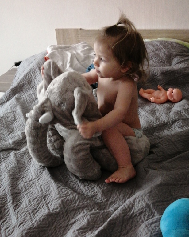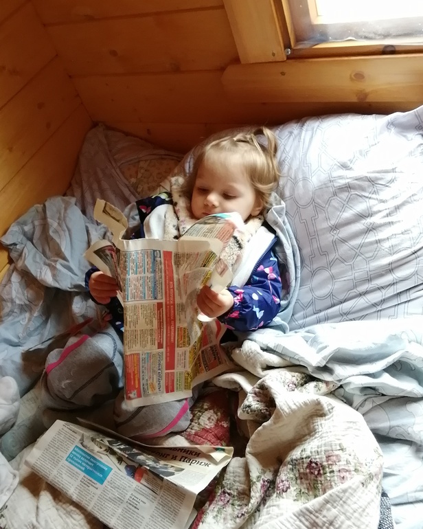 У нас растёт творческая личность. Она рисует на всех поверхностях всеми доступными методами, читает газеты, собирает пазлы (которые мама спрятала повыше, хотела попозже открыть), катается на слонах и других животных (котикам достаётся).
