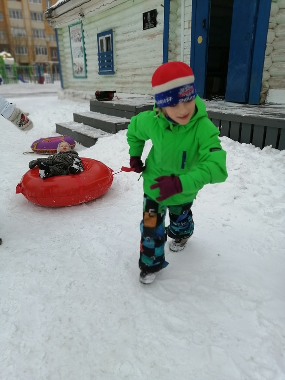 Всё накатились с горки, Вова наоралчя (он всегда расстроен, если брат занят своими делами, а не играет с ним), дети уронили его с ватрушки (сама дура, разрешила девочкам его покатать). Фото с классом сделали, видео на конкурс сняли, 13:15 бегом домой.