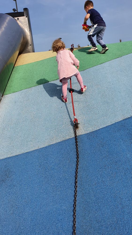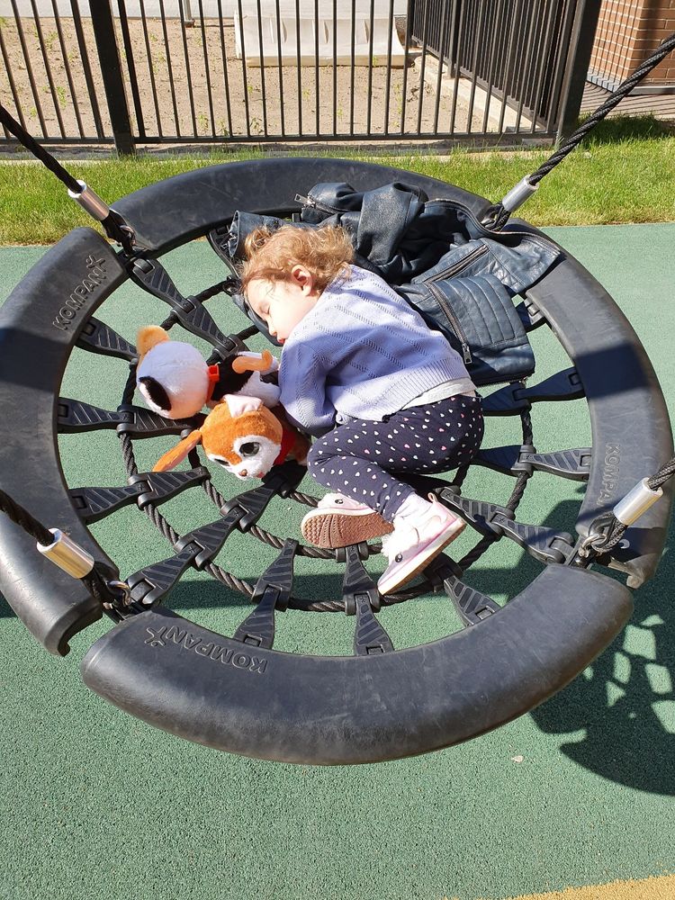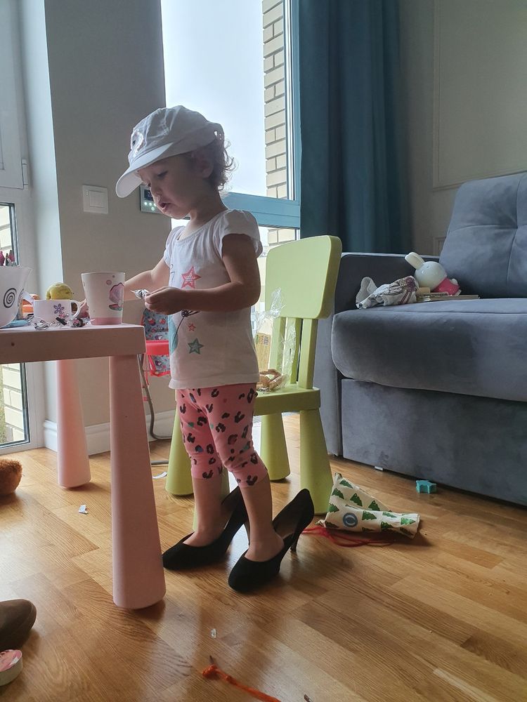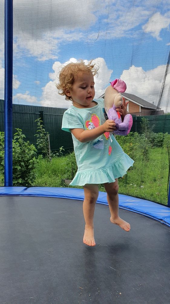 Физическое развитие. А все, как у всех - бегает, прыгает, лазает. Делает складку и пытается сесть в шпагат🤣 а еще садится в позу йога, закрывает глаза, поднимает руки и говорит "омммм". Где она это увидела, я не знаю🙈 С транспортом Софи осторожна. Опасается разгоняться.