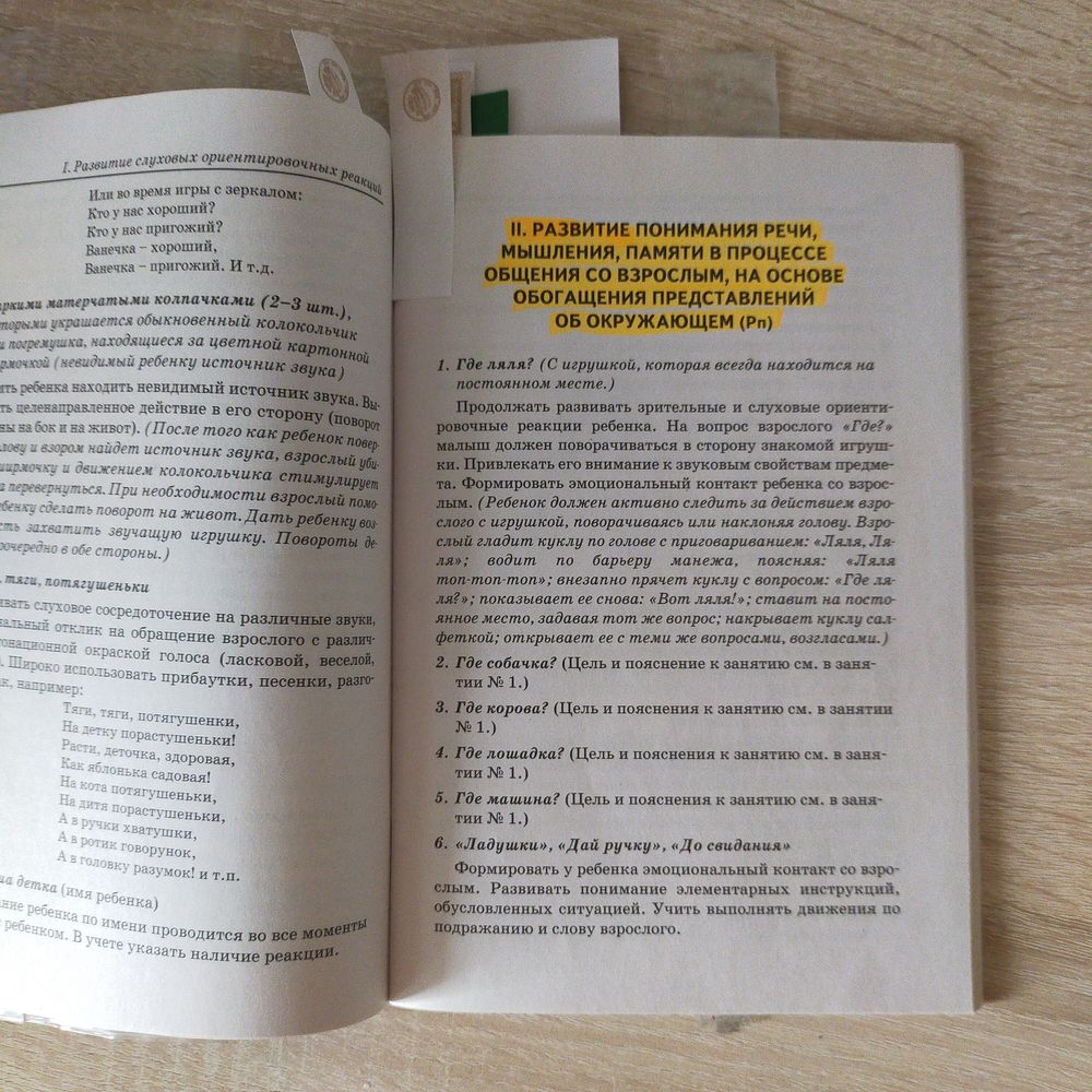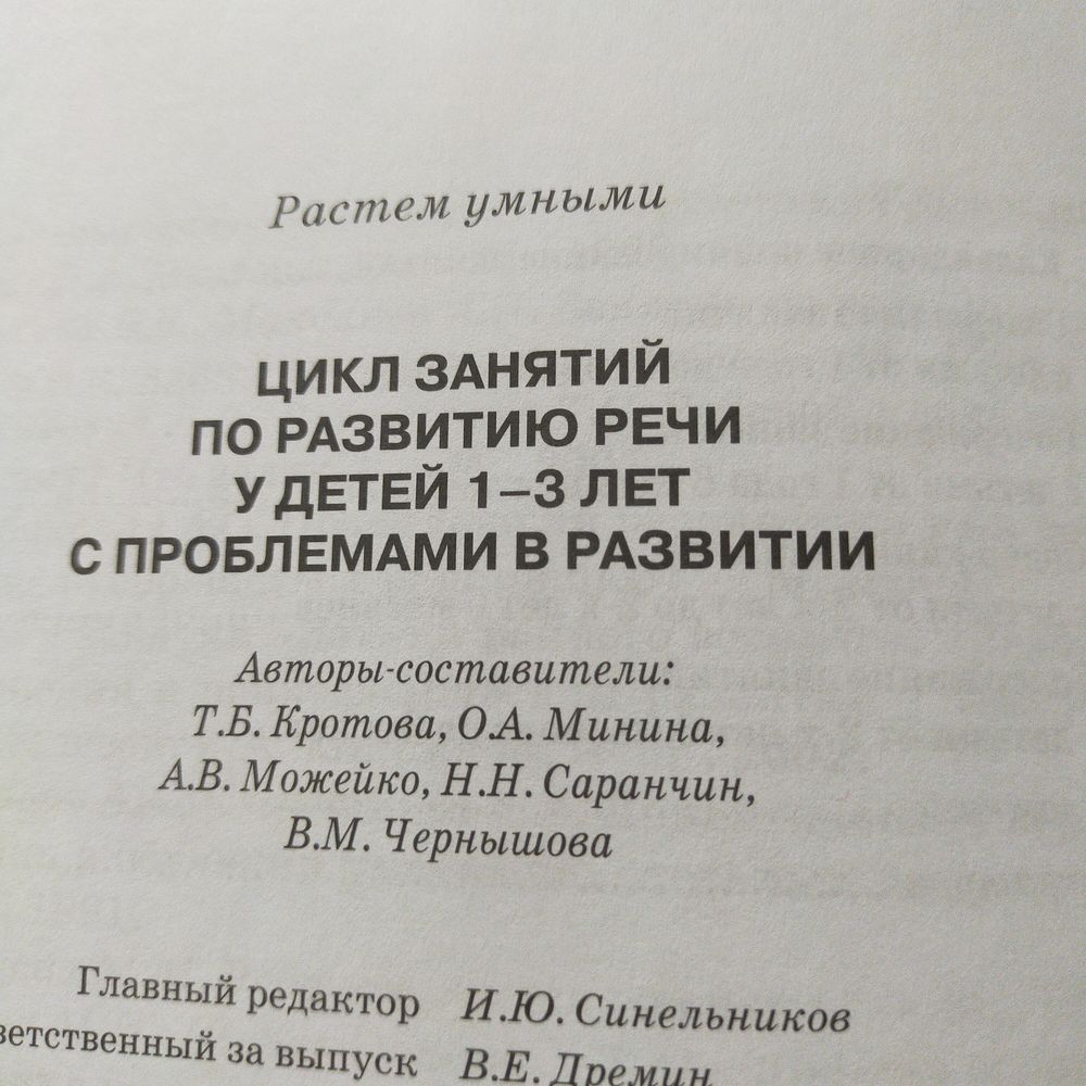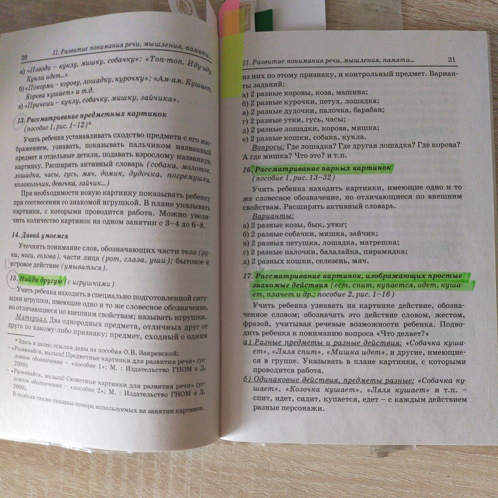 Это тоненькая книжка-методичка оказалась основой. К ней прилагаются две папки с картинками разрезными очень качественными, первая это предметные картинки, вторая сюжетные. В книге четко указаны какие и для каких занятий взять карточки. Это кладезь , ненавящево,понятно и прекрасно воспринимающиеся моим ребенком занятия. Тут не только занятия на речь , в ней 5 разделов познавательной деятельности и четко указано с какого начинать и при каких особенностях ребенка на что обратить больше внимания. Правда мы их проводим где придется: на диване, кухне ,длится такое занятия минуты 3. Однозначно нужная вещь. Даже если нет никаких нарушений считаю, что нужно иметь, хотя бы для того , чтобы знать что и как , чем заниматься с ребенком. Книга рассчитана на ребенка от 10 дней до 4 лет . Цена изделия смешная - 58р. И по 220 р картинки . И как оказалось самые ценные издания не стоят больших денег.