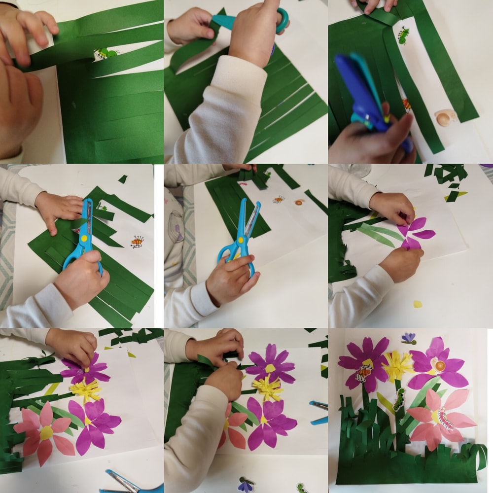 Но мне всё же удалось её немного заинтересовать. Мы решили спасти насекомых от травы, а затем сделать аппликацию с цветами и травкой и придумать, где кто живет.