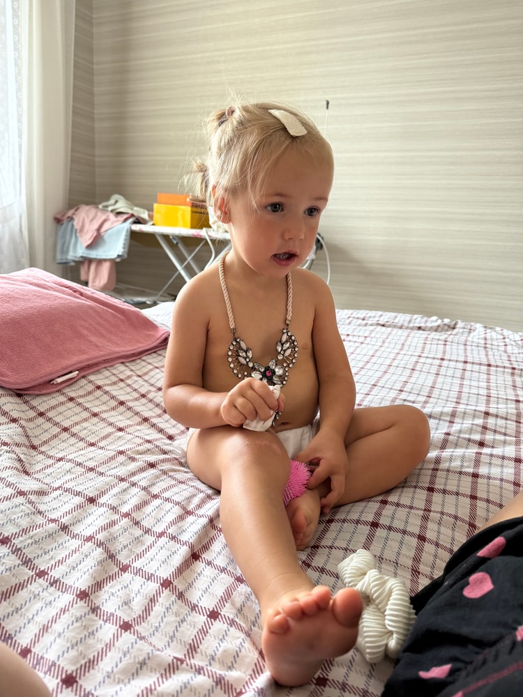 Гулять обожает, если видит, что кто-то одевается, тоже бежит одеваться. Сама надевает снимает штаны, носки, обувь. Прически в основном дается делать. Очень любит быть красивой - платья, носочки, обувь, заколочки…