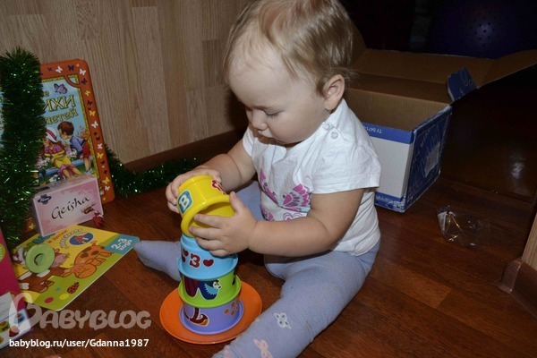 Вот Кристина уже собирает пирамидку. Она их очень любит.