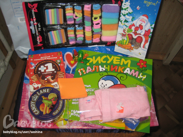 Ааааааньк! Эмоции выражать не буду, просто фотоотчетик прикладываю. Дарья получила резиночки, раскраску, колготки, шоколад, леденцы и стикеры (правда б/у, но дареному коню как говорится...) Еще была свечка со змейкой, но она к сожалению в дороге разбилась, так как подарочки были в пакете