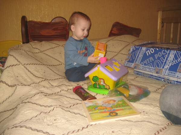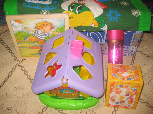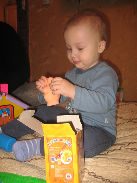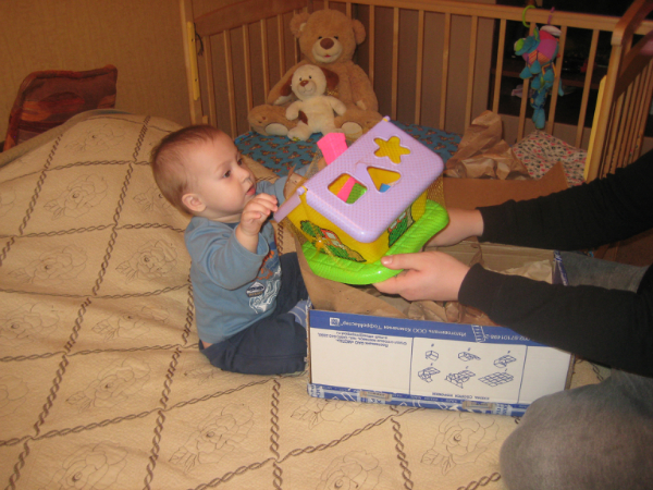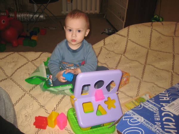 у нас такой же сортер,только сынок ни в какую не хочет засовывать фигурки через отверстия! просто берет,открывает крыжечку дома-и складывает))