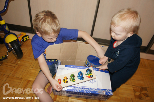 А вот и первая машинка и конечно Севе надо срочно поиграть готовой игрушкой!!!Старший братик у нас не жадный и с радостью отдал младшенькому)))