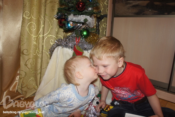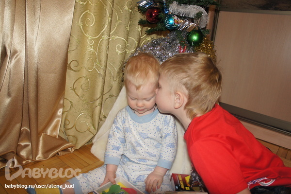 Так как Сева решил,что подарочек от Никитки (уж больно тот его утром тащил под елку) то решил отблагодарить братца поцелуем))Никитос ответил ему тем же!!!