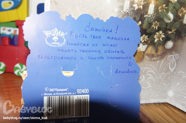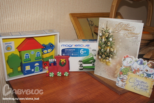 booka благодарность в личные сообщения и попросилась,что подарочек положу под елочку,так как в этот раз Никитос совсем был не в курсе и мы вечером наряжали нашу малявочную ёлочку (покупку большой отложили на следующий год,теперь благо есть куда ставить,в старой квартире только на маленькую и было местечко). Я сфотографировала подарочки и убрала до ночи. Никитка утром был весь в восторгах