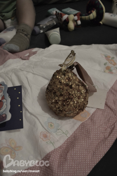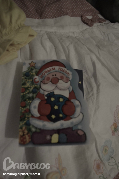 Платье шикарное, яркая футболочка, веселая мышка-пищалка, свечка-собачка, символ нового года - мягкая змейка, обалденная новогодняя игрушка-грушка в стразиках, елочный шарик-раскраска и целый набор Johnson's baby... и открытка, конечно, с именами наших новогодних волшебников!