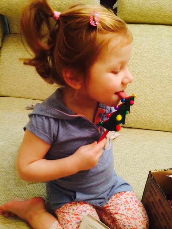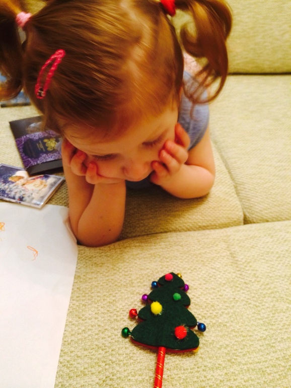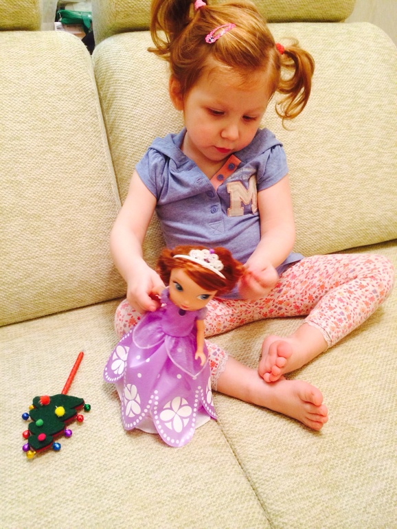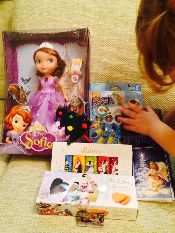 И там нас ждали чудо-подарки: карандаши для рисования в ванной (у нас таких никогда не было); праздничные сладости - печеньки мои любимые имбирные, шоколадки и волшебный черный шоколад для исполнения желаний :-), магнитик и открытка с теплыми пожеланиями; совершенно очаровательная куколка София (я так полагаю, выбор был не случаен, поскольку по цвету волос они с дочкой одинаковые и кстати у нас таких куколок тоже не было еще, только пупсы) и "какой-то странный очень леденец" - версия Ариши :-)).