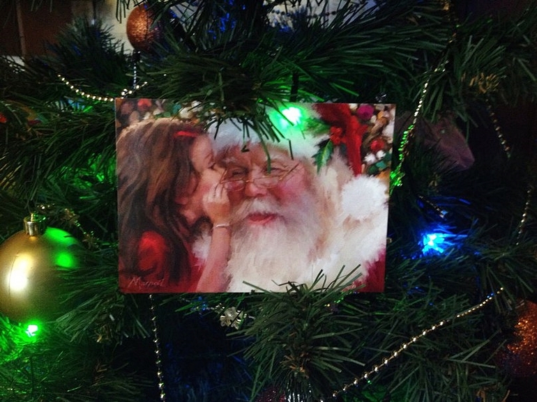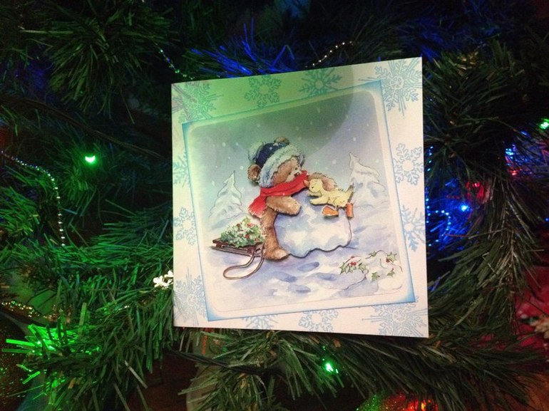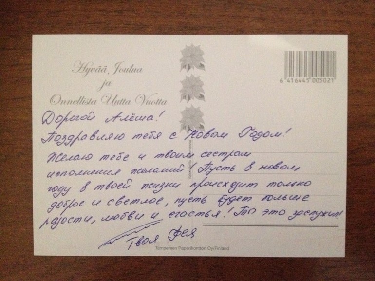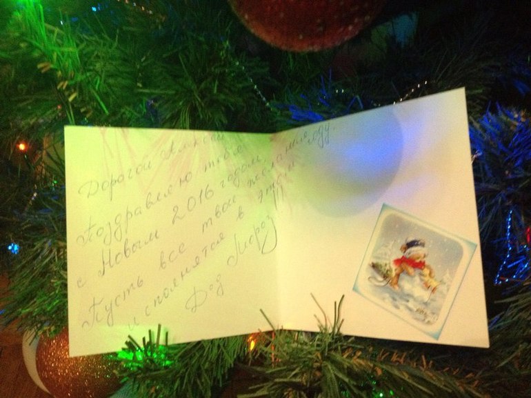 Алешка сразу побежал смотреть и доставать сюрпризы, а там и сладости и подарок и открыточка с теплыми словами для нас, спасибо Вам огромное, очень трогательно и безумно приятно! Открыточка украшает теперь нашу ёлочку)))