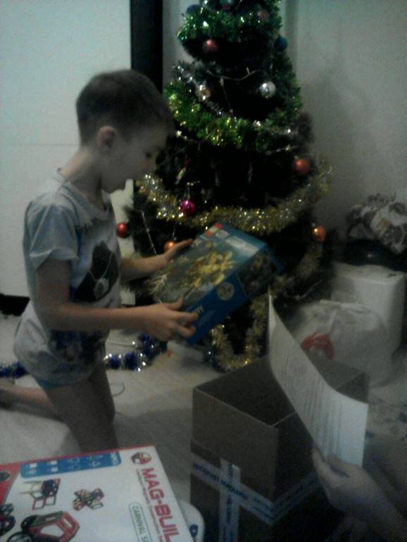 ! Посылочка приехала прямо из Детского мира курьером. Сразу открывать не стали, даже сама не подглядела, честно скажу))) Положили все под елочку! Дети утром в нетерпении кинулись к елочке. У нас еще племянница была, хоть и самая старшая, а ждала больше всех что Макару прислали)))