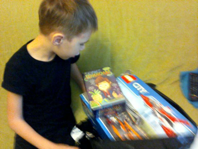 Книга с транспортом, для Вани скорее всего)) Он оценил, техника наше все))) На фотках Вани нет, он спал и все пропустил)))