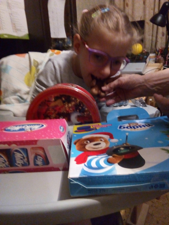 Во-первых, Аня была на уроке, когда позвонил Дедушка, пришлось отвлечься, Аня начала плакать, но поняв, кто же к ней пришел, обрадовалась очень сильно и начала свой монолог:)) "Дед Мороз, я хочу тебе рассказать..." и начала свою только что выдуманную сказку про цифры, потом вторую сказку, а потом увидела красный мешок и без стеснения потянулась за ним:)))) А там!!! Что там было!!!! Коробка Барни и следом Милкивей, в квартире стоял такой визг, и я думала, Аня выпрыгнет из своего стула, она аж на подножку сама встала)))) Как же мало нужно для счастья))) Но как ни странно, попросила вначале Барни, а потом милкивей))) Третья очередь досталась Киндеру)) а потом печенье))) Печенье кстати Аня потом отдала мне, маме))) Говорит, я не жадная, на, мама))))