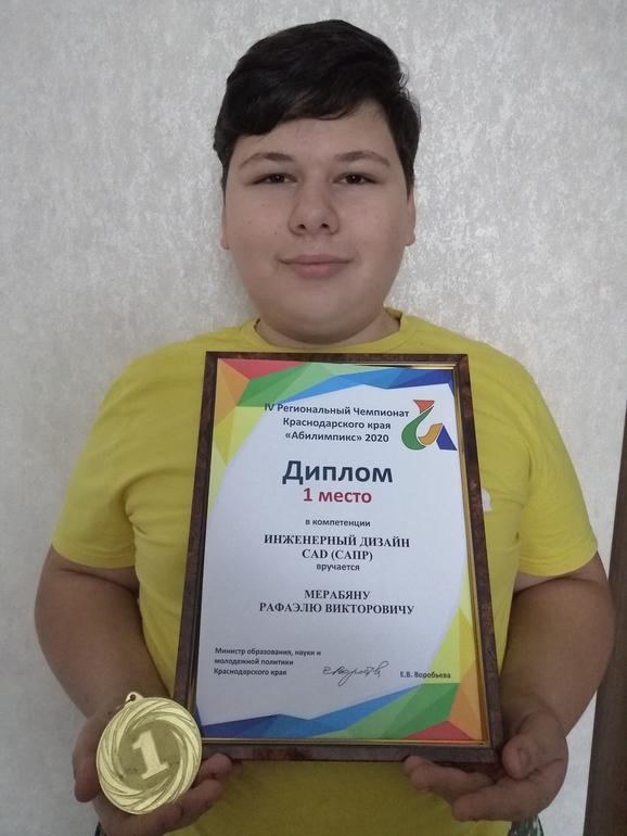 Рафаэль победитель и призер чемпионата для инвалидов Абилимпикс, ЮниорПрофи, компетенция "Инженерный дизайн САD".