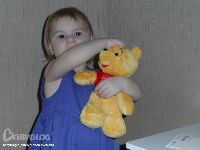 чудный Винни Пух из удивительно нежного материала- велюра. Нам из такого материала моя мама покупала мишку, но другого. Карина он него была в восторге, а тут еще один мишка и такой же нежный.