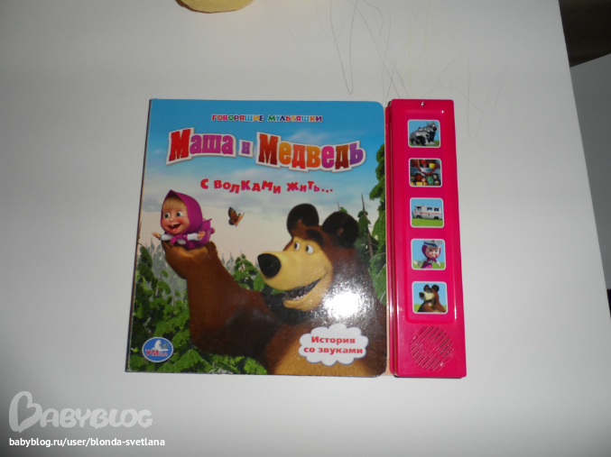 Книжка Маша и медведь тоже очень понравилась- мультики она готова смотреть круглые сутки, а нажимать кнопки и слушать Машу ей ооочень понравилось.
