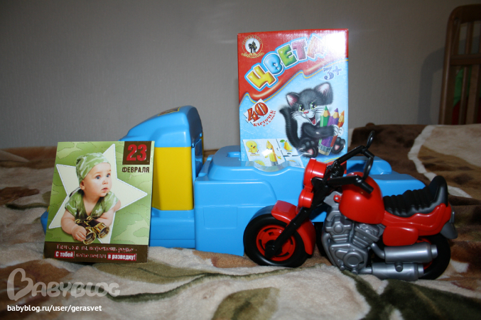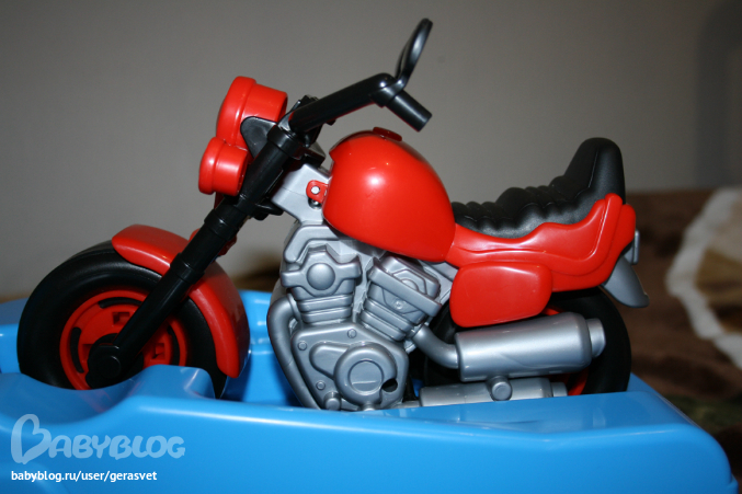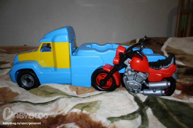 а вот наш чудесный подарок! Эвакуатор с классным мотоциклом! Викуля - настоящая Фея, потому что как-то узнала, что у нас уже есть мотоцикл этой фирмы, другой и зеленый, и я в семечтала собрать все мотоциклы из этой серии) вот он и приехал к нам из воронежской области)))