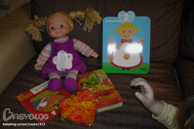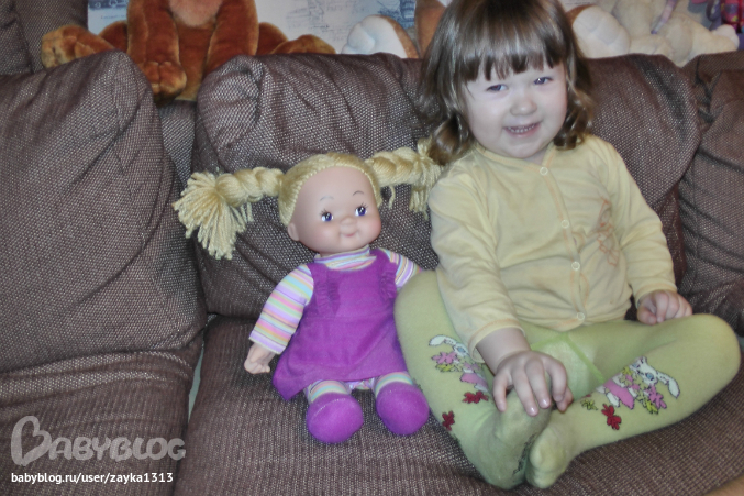 в общем, рады, что вам понравилось! а с лялей вообще забавно вышло))) ходила выбирала подарочек (без Алинки), случайно среди других увидела эту куклу - она одна оставалась, и уж очень она мне понравилась, вот и отправили вам! а через неделю вместе с Алинкой уже были в другом магазине и там тоже оказались такие же куклы, Алинка как увидела, так всё - "надя!" Вот и у нас теперь такая же живет)))))