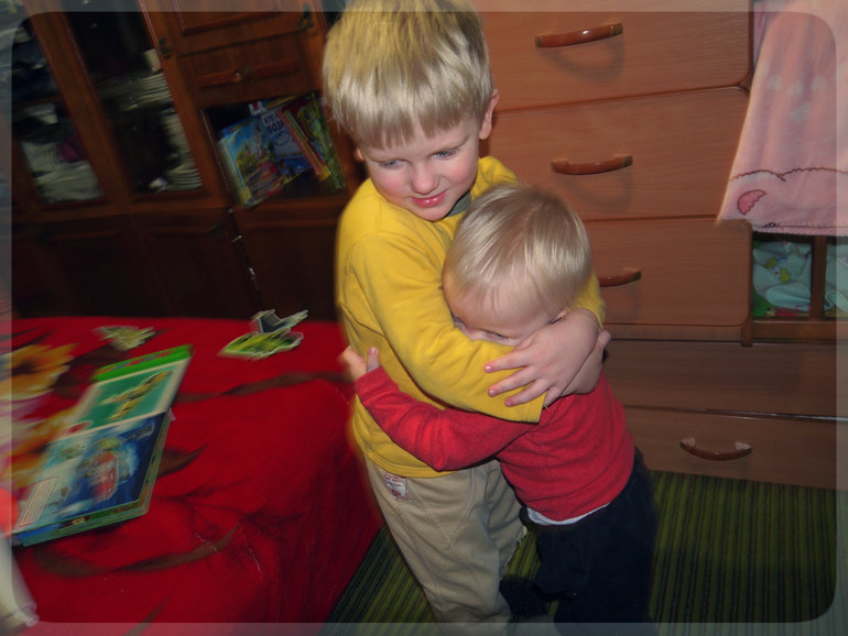 Воспитание.Понятное дело - игрушки поделить они не могут НИКОГДА! Наверное, это у всех так... Она возьмет что-нибудь, и, даже если это чисто ЕЁ игрушка (коляска с куклой), он отбирает с криком МОЁ. Она в рёв. Если, не дай Бог, это его машинка, он может ее и оттолкнуть, и по руке стукнуть... При этом может ни с того, ни с сего подойти и дать ей в руки свою машинку поиграть... Пыталась научить его меняться, забрал у нее одну игрушку - дал перед этим другую. Раньше прокатывало, а теперь нет, малявка возмущается, хочет именно то, что взяла... А недавно она начала братика БИТЬ! Подойдет и просто ударит со всей силы открытой ладошкой! Вот и как 1,5-годовалой объяснить, что драться нельзя, при том, что братик сам может ее толкнуть, хоть он "просто так" этого никогда не делает... В то же время он относится к ней в целом с нежностью, подходит обнять и поцеловать, она тоже бежит к нему, раскинув ручки и они стоят и долго обнимаются...:) Сразу скажу: внимание уделяю обоим одинаково, даже старшему побольше, т.к. мы с ним конкретно занимаемся по развивающим книжкам и читаем, что он сам выбирает, а с малявкой только картинки смотрим и стишки рассказываем. Какие только беседы я с ним не проводила по поводу того, что нельзя толкать и бить сестренку, и наказывала (закрывала в комнате), это может помочь на один вечер, а с утра все сначала... Конечно, если я присутствую при их играх, то предотвращаю "нападения", но я могу быть на расстоянии и не успеваю подбежать или вовсе на кухне... Мирно играть они тоже, конечно, могут, но 50 на 50 с "атаками".
