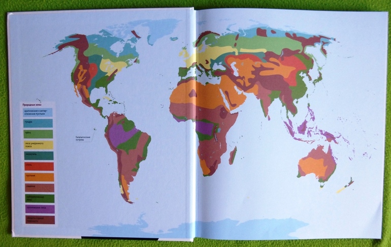 В книге информация систематизирована, поэтому легко запоминается. На форзаце рисунок с обозначением где какая природная зона, на нахзаце рисунок с географическими поясами.