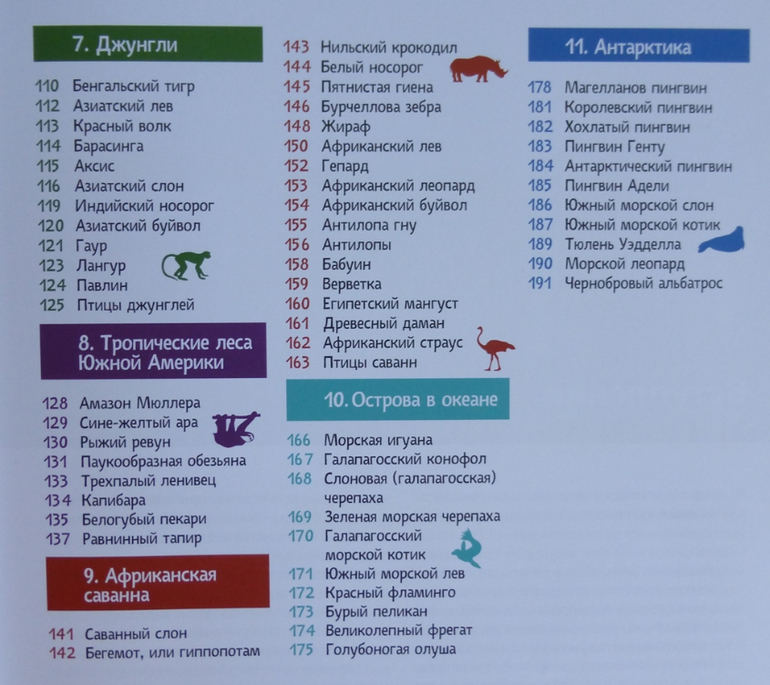 С помощью оглавления легко осуществить поиск того или иного животного, которое интересует, также из оглавления легко определить в какой части нашей планеты обитает данный представитель фауны