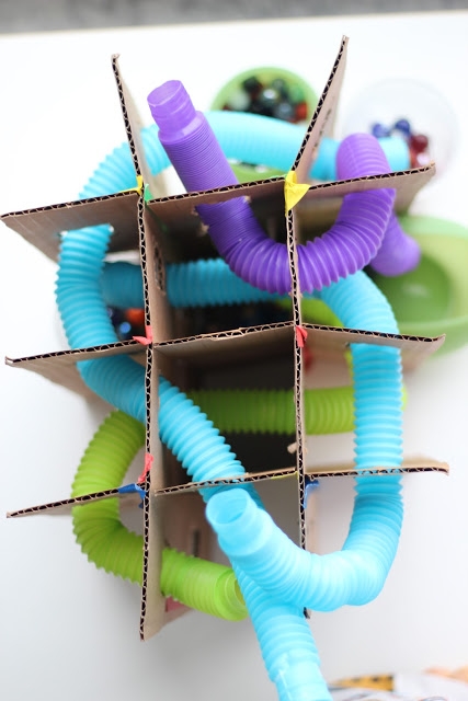 Из гофротрубок - таких пластиковых трубок-гормошек - можно сделать марблран или даже предложить детям самим его сделать. Для этого нужно просто сделать структуру из картона с дырками, в которые можно вставлять эти трубки. Эту структуру можно сделать из коробки для переноски бутылок, молочной коробки, карандашей... Карандаш, трубка, две резинки и шарик - отличный дорожный конструктор. Карандаш с трубкой можно просто крутить по полу или столу, чтобы шарик прошел путь по трубке, или держать вертикально - это самый легкий вариант.