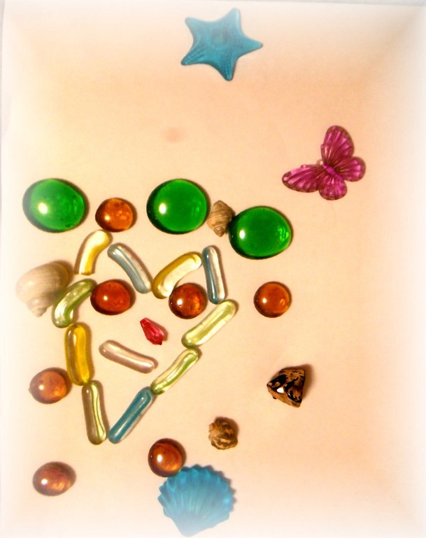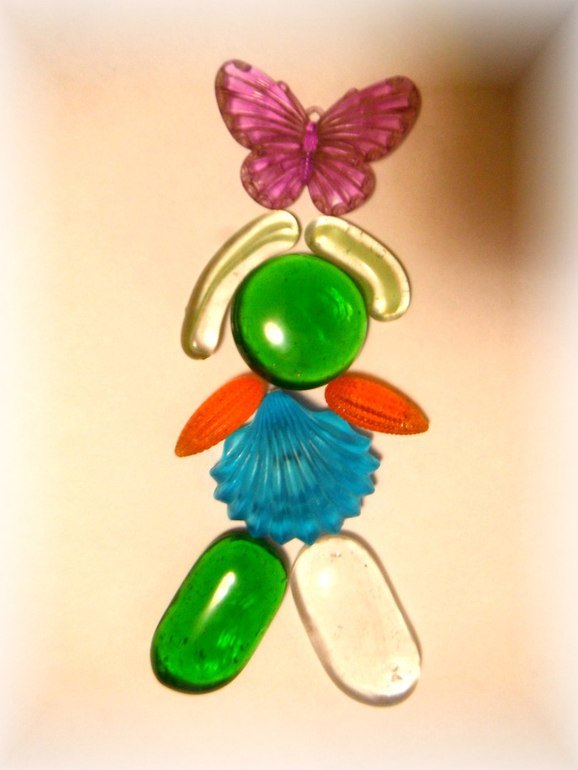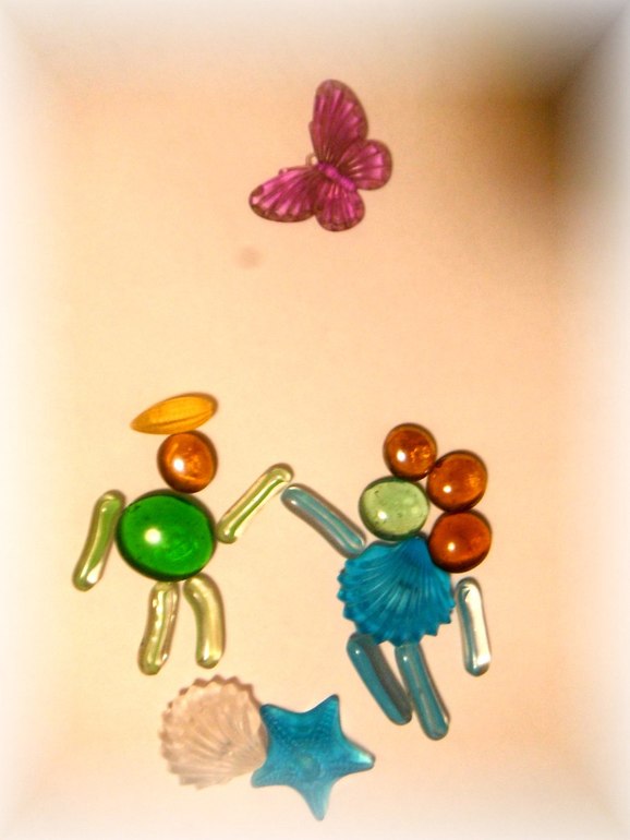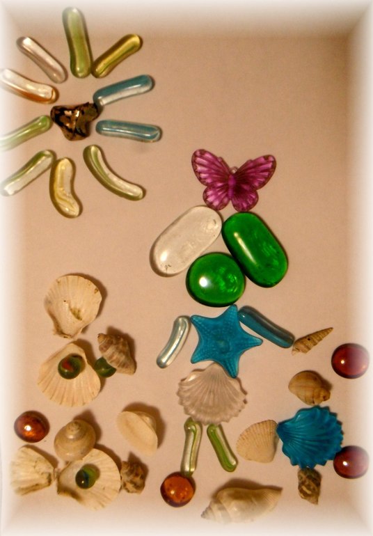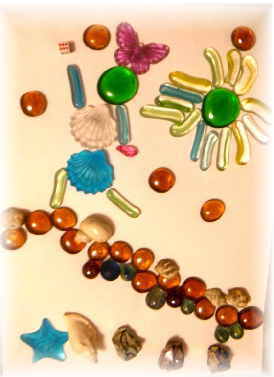 В один из вечеров мы перебирали цветные стеклышки, которые купили для аквариума. И вот какие картины получились у Софии.