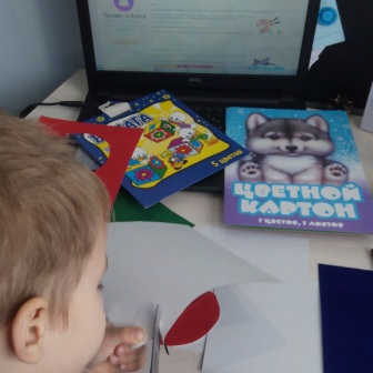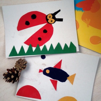 Аппликация у нас по-прежнему остается фаворитом, по-этому делали мы открытки именно в этой технике. Я выбрала идею аппликации из геометрических фигур, чтобы заодно их названия повторить. Мы выбрали сделать рыбку и божью коровку отсюда. У Глеба все лучше и лучше получается вырезать, даже уже мелкие детали начинают ему подаваться.