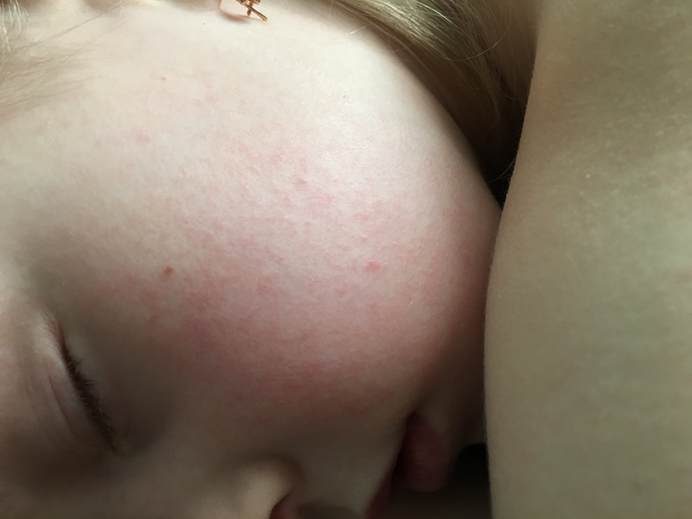 Сразу как забрала из сада обратила внимание на небольшую еле заметную сыпь на щеках ( не аллергия ,нового ничего не вводили ,да и не особо ребёнок мой аллергенен!)