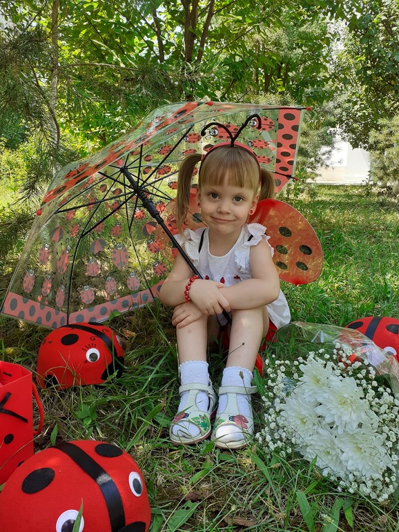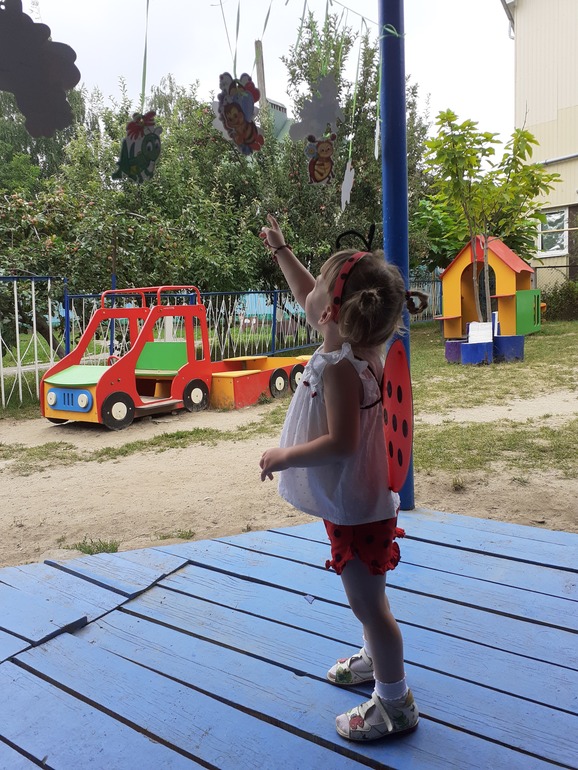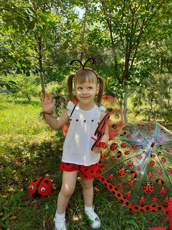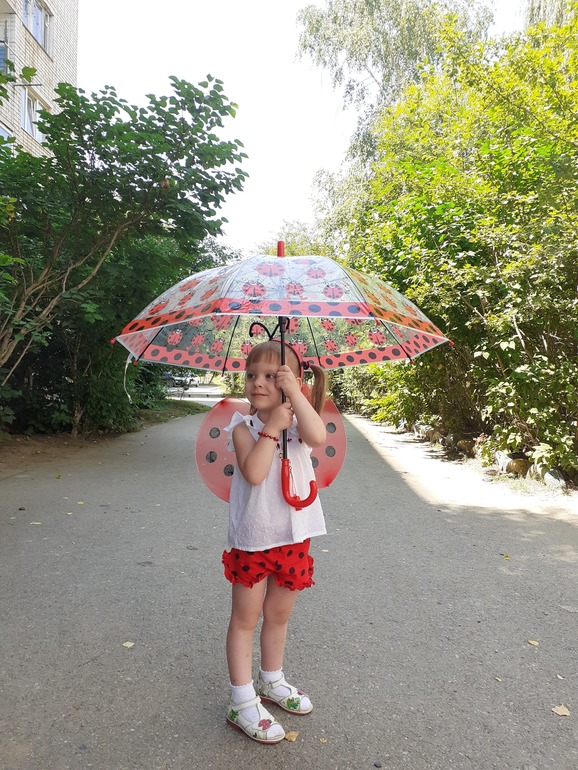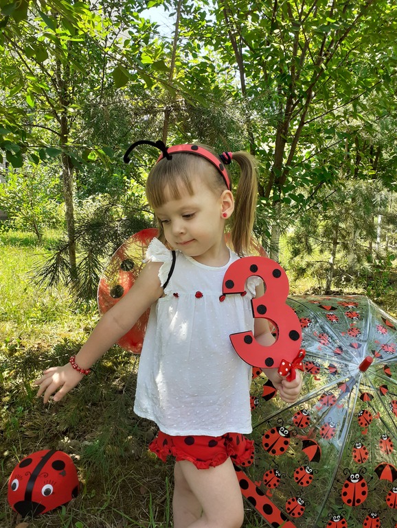 Праздничный наряд планировался совсем другим,долго искала задуманную ткань,чтобы сшить Полине платьице ,но к сожалению так и не нашла...Случайно встретила шкодные шортики за очень смешную цену,белый невесомый топ,который куплен был еще в полтора годика украсили пуговками- коровками,плюс ободок с усиками,крылышки и образ божьей коровки готов! Наша дорогая бабушка также, еще зимой купила Полинке крылышки и шляпки для игры ,а оказалось прям в точку!
