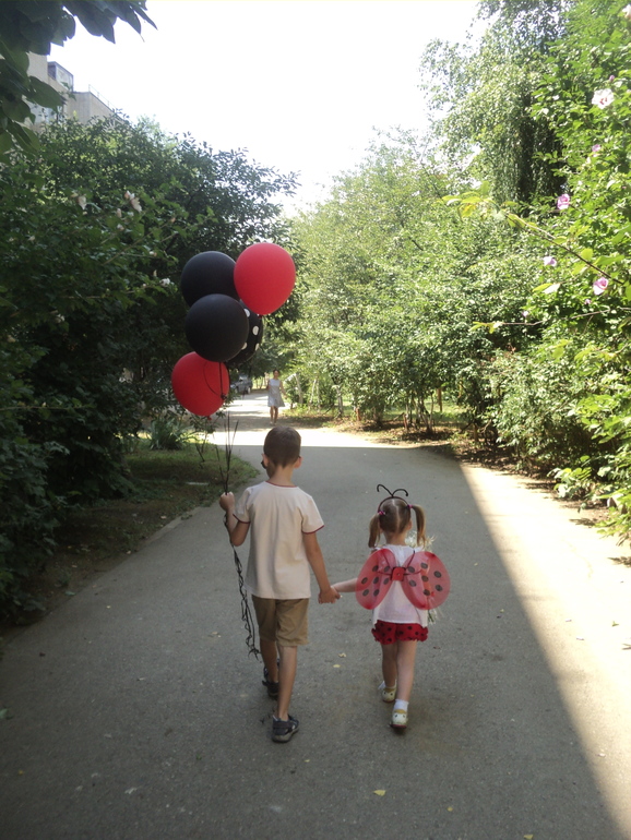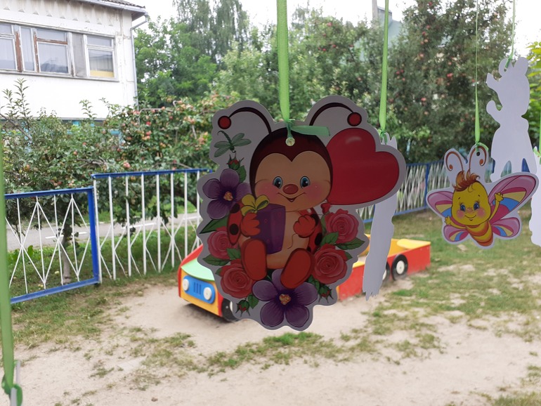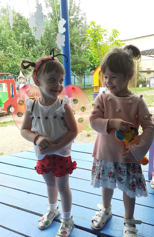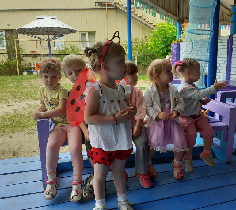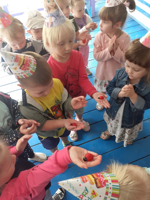 "Каравай" и угощения по традиции в группе после завтрака с воспитателем,а позже вся малышня выбежали на прогулку,где мы для Полинки провели игровую программу и подарили всем деткам по Божьей коровке.