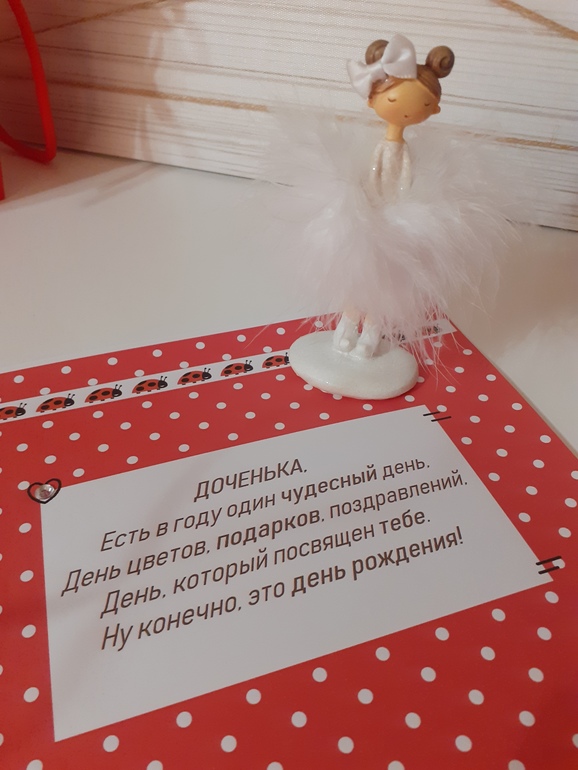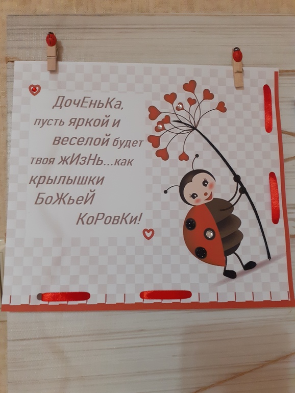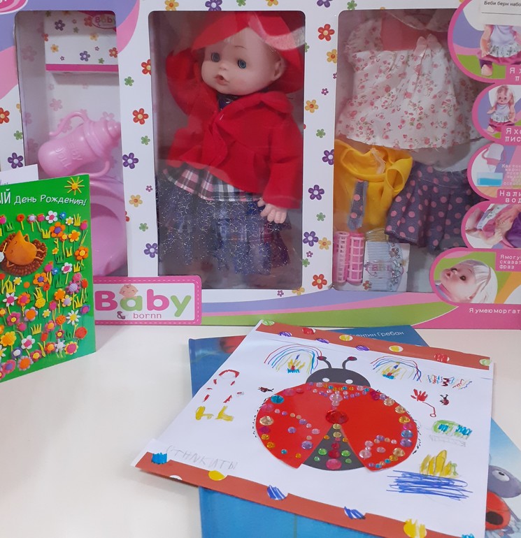 Музыкальная Божья коровка, книга про Божью коровку Сюзетту, кукла-пупс,множество резиночек и брелочков,вкусных конфеток-печенек-мармеладок...но самый дорогой подарок оказался от Никиты- открытка-аппликация со стразиками,Полина оценила старания братика!