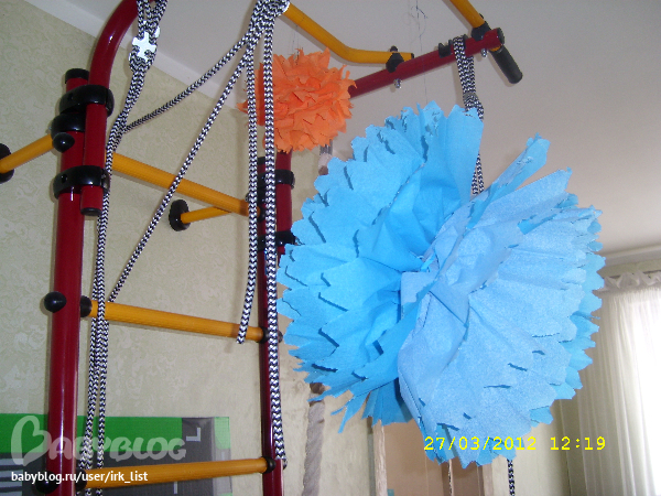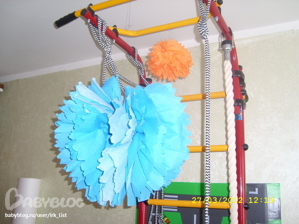 Это обратная сторона. Собиралась вешать два помпона на люстру, но решила к празднику повешать на турник по краям, чтобы не видно было обратную сторону. И еще, мне кажется, что если на люстру такие большие повешать, будет темно в комнате.