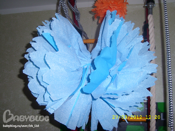 Второй будет зеленый. Вот такую бумагу использовала (р-р 50*250 см). Очень тонкая бумага, внутри помпона много разрывов. Ушло 2 упаковки, но слоев получилось 9 (один лист оказался короче). А может, как раз 10-го слоя и не хватило для всесторонней красоты? Зеленый сделаю ближе к ДР.