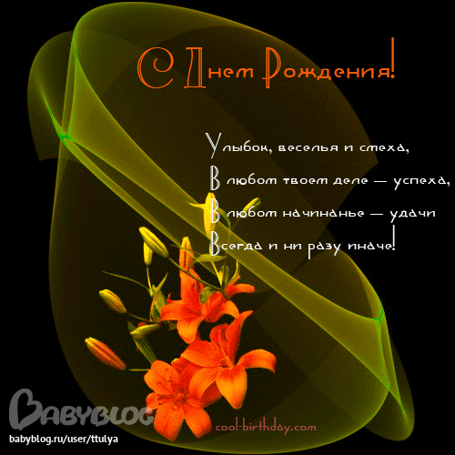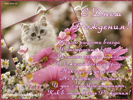 С днем рождения, тебя, С днем рожденья! В этот славный денечек весенний Тебе пожеланий не счесть, В них все сокровенное есть! А главное - чтобы весна и любовь, Всегда будоражили чувство и кровь! Чтобы быт серостью своей Не затмил и каждый твой день, Только солнечным был!