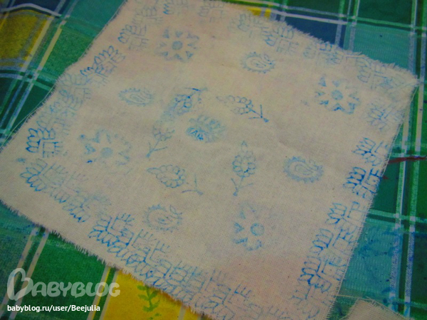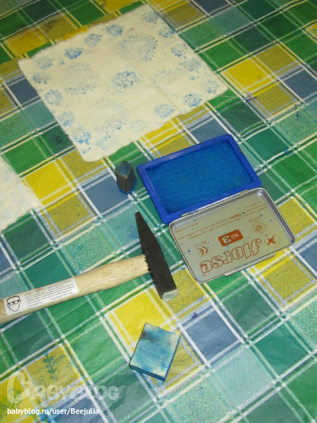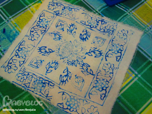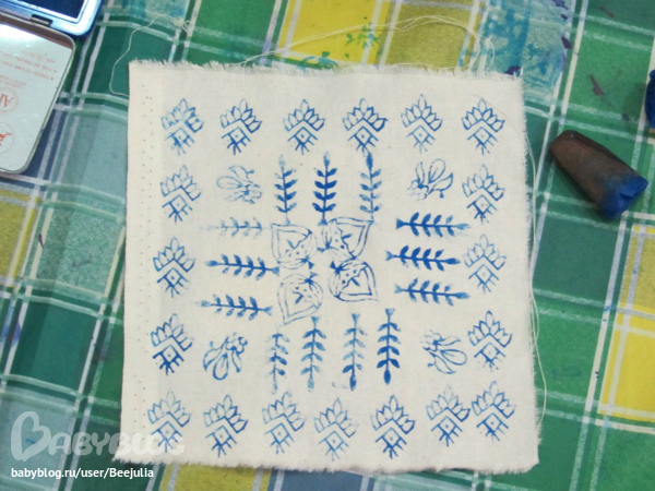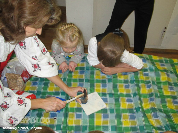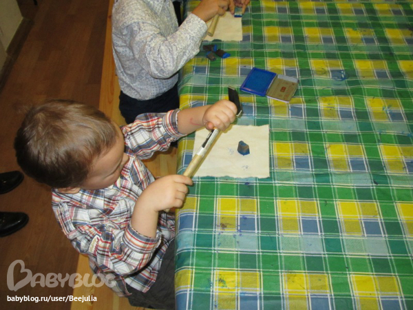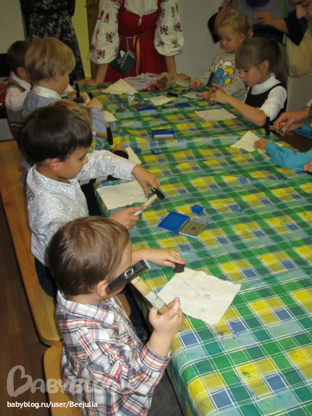ну а когда все давольные детки пришли, то началось чаепитие (еду свою приносили), потом ребята играли с воздушными шариками, пока взрослые освобождали стол. А потом для деток был проведен мастре-класс по набиванию рисунка на ткань. Вот это было интересно как и малышам так и взрослым деткам.