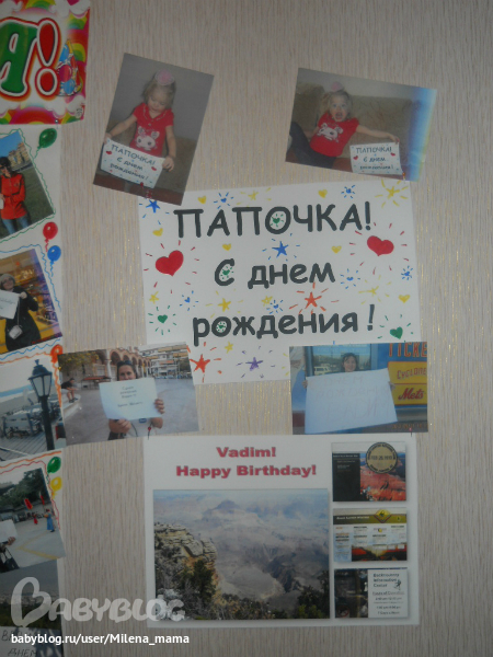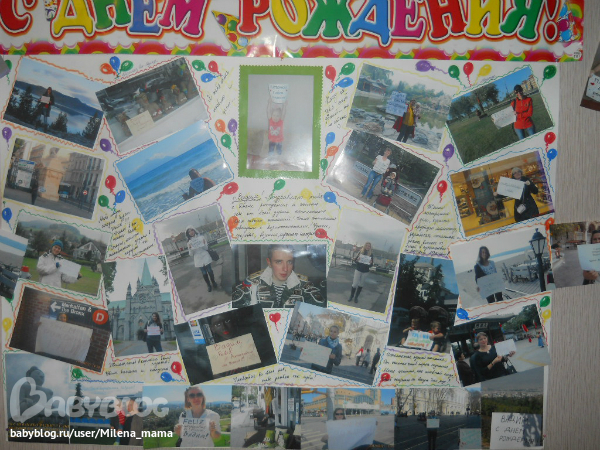 Нашему папе очень понравился именно этот подарок больше всех. Его тронуло,что совершенно незнакомые люди со всего земного шара откликнулись на мою просьбу и поздравили его с днем рождения. Долго рассмотривали фотографии всех стран, надпили на разных языках, плохо,что не успела подписать около фотографий откуда они, пришлось объяснять это мужу,а потом и его друзьям что и как и откуда) Самое первое,что все делали -это вглядывались в лица людей, пытаясь узнать..Муж даже кого-то узнал )))))))))))))))))) думал,что узнал))) потом приходит мысль -как это я всё смонтировала,но как так люди разные.. А потом уже все понимают,что это всё по-настоящему.. фотографии, поздравления...