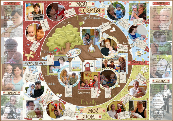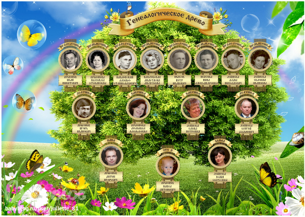 В фотошопе. Просто взяла подходящий фон с деревом, добавила свои рамки для фото и вставила туда отсканированные и отретушированные фото родных.