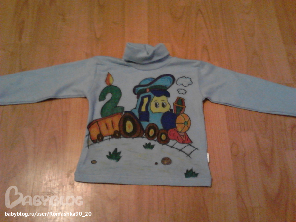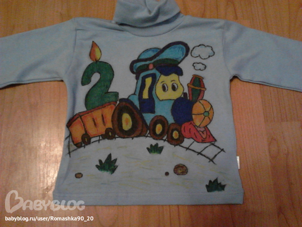 День рождения ДетскийДень Рождения будет на тему паровозиков и с этим нарисовала вот такой паровозик на кофточке Нашего машиниста))))