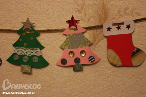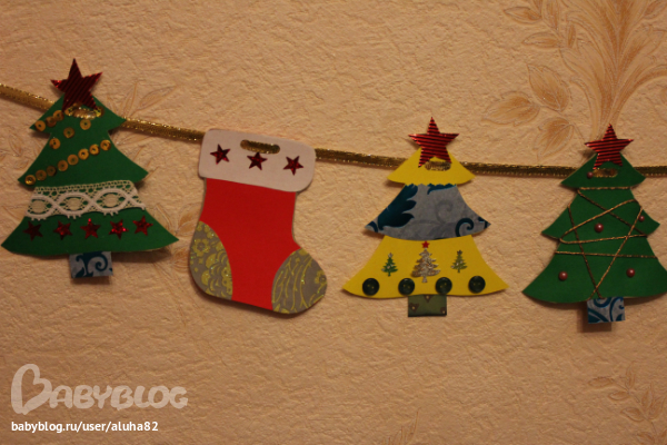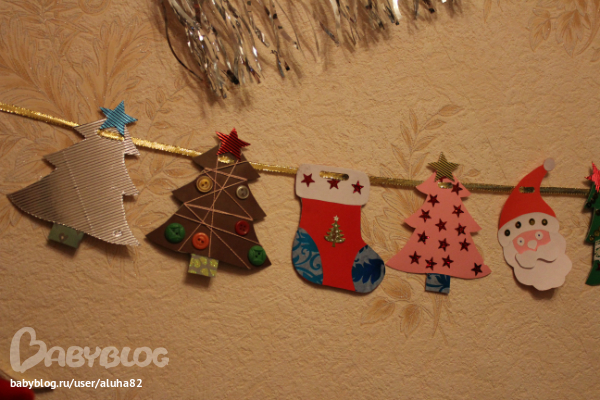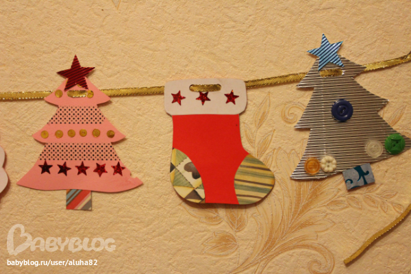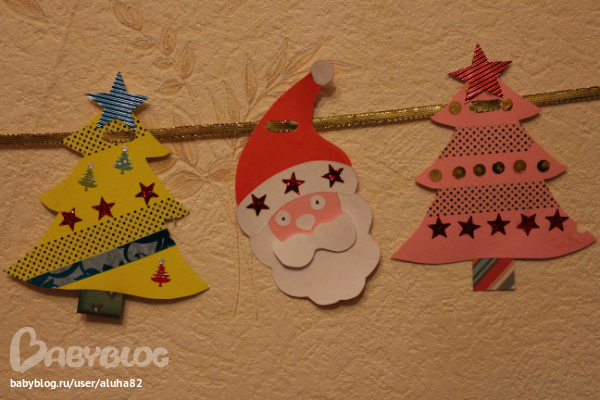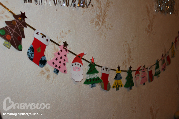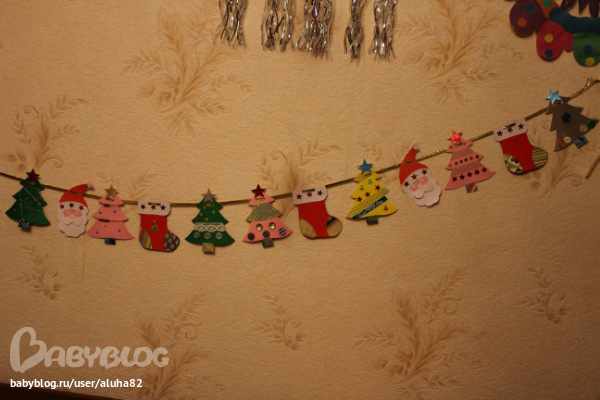 Новый ГодНа той неделе нам дали задание в садике сделать новогоднее украшение. Я долго думала, чтобы такое сделать. И решила, что сделаем мы гирлянду. И вот, что у нас получилось: