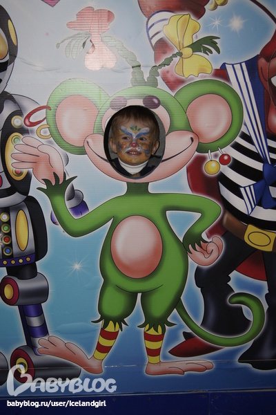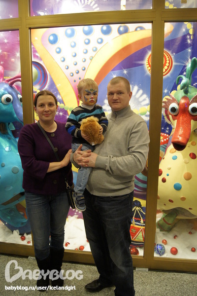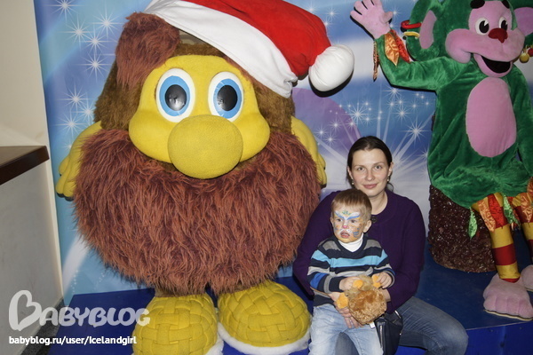 Конечно было волнительно как сын (ему сечас два и два) воспримет необычную веселую, но при этом незнакомую для себя обстановку. Но как оказалось, волновались мы, родители, зря - Артему очень понравилось Новогоднее представление "Тема и машина времени". Для тех, кто никогда не бывал в этом театре, скажу, что домовенок Тема - это символ театра, главный сказочный персонаж, который играет во всех тамошних детских спектаклях. Наш Артем выражал свой восторг громко хлопая в ладоши, заливисто смеясь, раскачиваясь у папы на коленях в такт звучащей музыке. Особенно ему понравился момент когда в зал сказочные герои выбросили пять огромных надувных шаров, которые детки-зрители вместе с вошедшими в раж взрослыми подбрасывали вверх и дальше по рядам. Артем тоже привстал, хотел дотронуться до такого большого шара, но до нас он, к сожалению, не долетел - мы сидели в ложе. Ну и конечно сильное впечатление произвел настоящий Дед Мороз со Снегурочкой (кстати, только костюм Деда Мороза обошелся театру в кругленькую сумму так как был расшит стразами Swarovski, Золотое кольцо не скупится на реквизит), домовенок Тепа в лобби, с которым мы сфотографировались, ну и конечно песни и танцы на сцене.....сын неравнодушен к музыке...:)))) Ну а после представления мы фотографировались, гуляли по празднично украшенному театру и даже сделали сыну аквагрим....