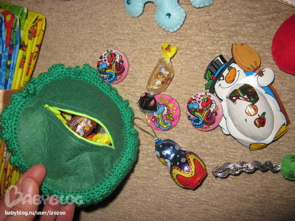 Поначалу я подумала, что елочка набита чем-то вроде пластилина (или в этом роде), и носит чисто декоративный характер. Удивительно было обнаружить, что это "мешок" со сладостями, шоколадными медальками, конфетками и т.п.!! ПРОСТО СУПЕР!!!