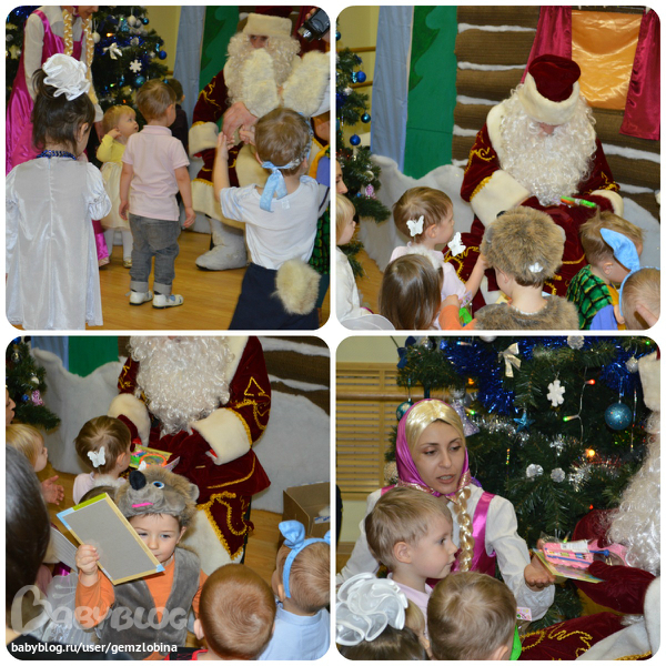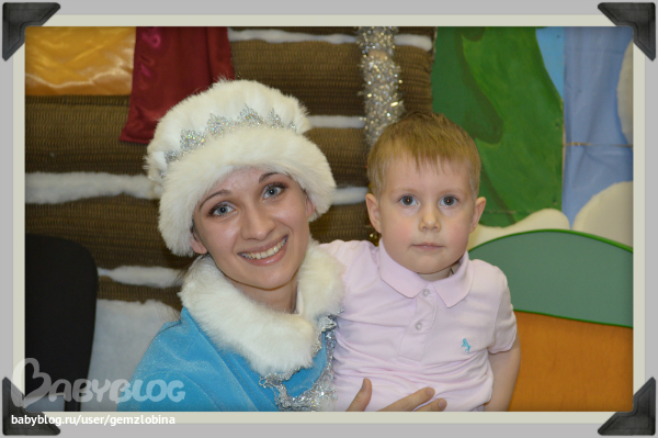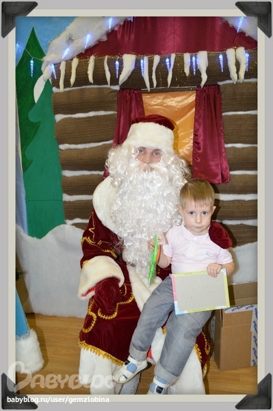 Новый ГодТ.к. в сад мы пока не ходим, то и на ёлку там не попали. Пошли в детский центр.По сравнению с прошлым годом программа была хуже, а деть вел себя просто потрясающе: бегал, веселился, прыгал, слушал и пытался понять, что просили сделать герои и даже в хороводе пел. Сам - то он поет, но хором было первый раз. Очень трогательно! Еще Святу было важно спеть ДМ, сольно, чтобы он потом подарок подарил. А подарки стали просто так давать и он долго ждал, когда ж ДМ попросит спеть песенку, целый день ведь репетировал))) Не испугался и сфоткался с дедом.