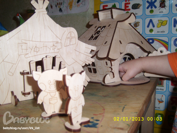 Подарок Вали и деды- "Три поросенка" Волк сразу отправился на диван, подальше от поросят, а поросята ходят в гости и играют в прятки! Очень весело, но я сплю на матрасике под лестницей)) Гера пришел и спел мне куплет "Спят усталые игрушки", погладил по голове, нежно приговаривая: "Спи, спи!" И вернувшись к столу с поросятами, пролдолжил весело и шумно: "Мама! Куда поросенок спрятался?! Мама! Вот где он!....."
