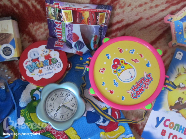 Старшему будильник, чтобы уроки не просыпал.и жевательный мармелад, который был съеден за пару секунд...(ням-ням)